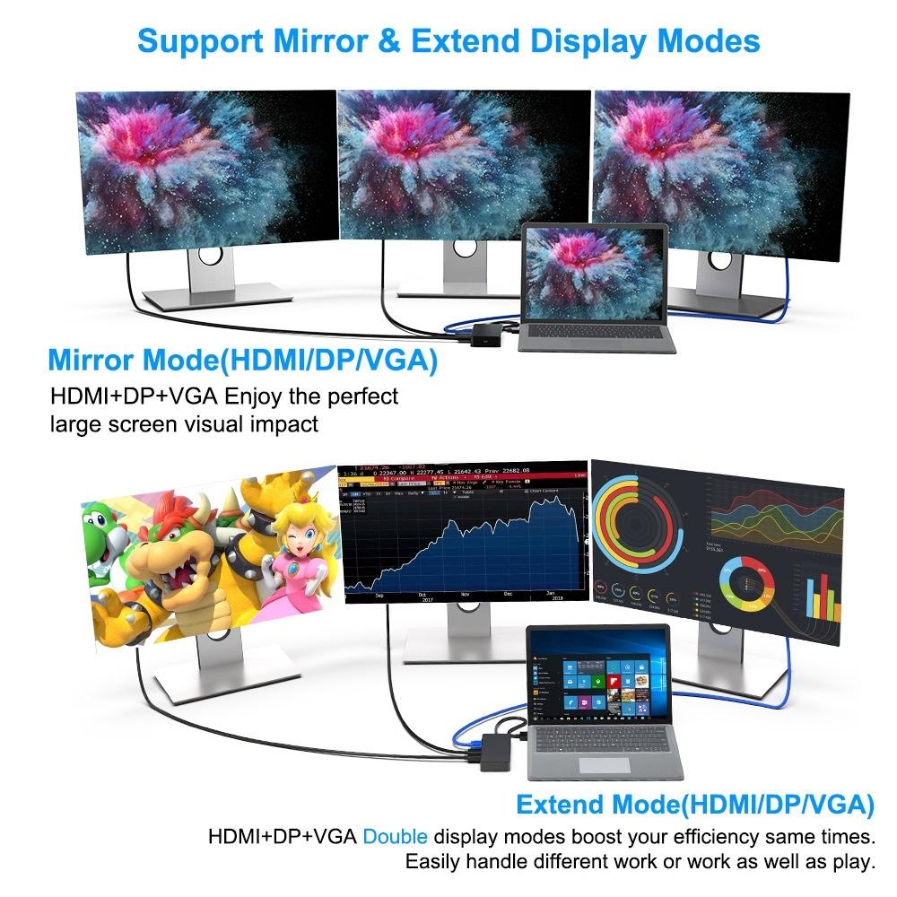 • Supports 4K HD output at 30Hz for DP/HDMI interface and 1080P/60Hz for VGA interface