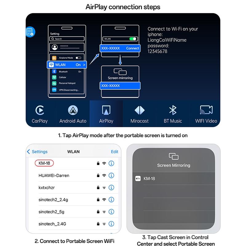 • Function: carplay + android auto + airplay + wifi + bluetooth 5.2 + fm + driving recorder + aux