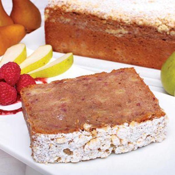 A Moist Bread Laced With Chunks Of Pear And Raspberry, A Hint Of Cinnamon And Dusted With Icing Sugar Ingredients: Wheat Flour, Sugar, Pear (16%), Egg, Canola Oil, Raspberry (11%), Baking Powder (Contains Raising Agents (450, 500)), Butter (Contains Milk), Vanilla Essence, Oats, Lemon Juice, Stabiliser (410, 460, 412), Cinnamon, Dusting Sugar, Raising Agent (500), Salt