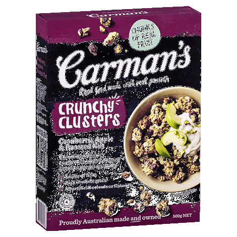 Carman'S Cranberry & Apple Clusters G Ingredients: (Sulphite Free Fruit) Whole Grains 61% (Whole Grain Oats, Puffed Rice [Rice, Emulsifier (471, Salt, Vitamin E}, Whole Grain Oat Flour), Fruit (Cranberries 7% [Cranberries, Sugar, Sunflower Oil], Apple 4%), Raw Sugar, Nuts 5% (Almonds, Pecans), Honey, Pepitas, Corn Starch, Sunflower Oil, Cinnamon, Natural Vanilla Flavour, Antioxidant (E307B).