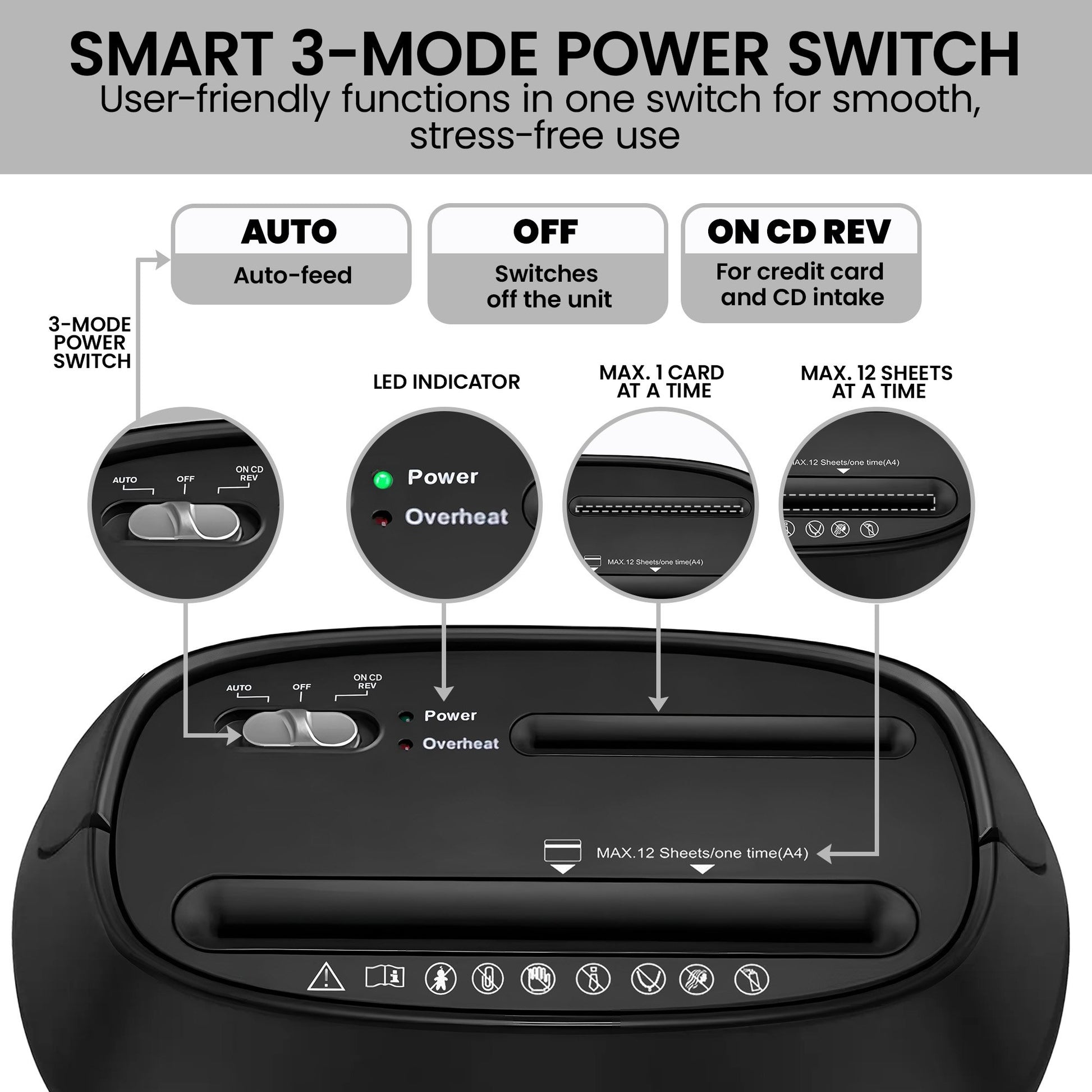 Tame the paper chaos with the powerful paper shredder by Centurion. It crosscuts up to 12 sheets at once, slicing through paper, credit cards and discs with ease. Perfect for home or office use, it has built-in overheat protection and a handy LED indicator for peace of mind.