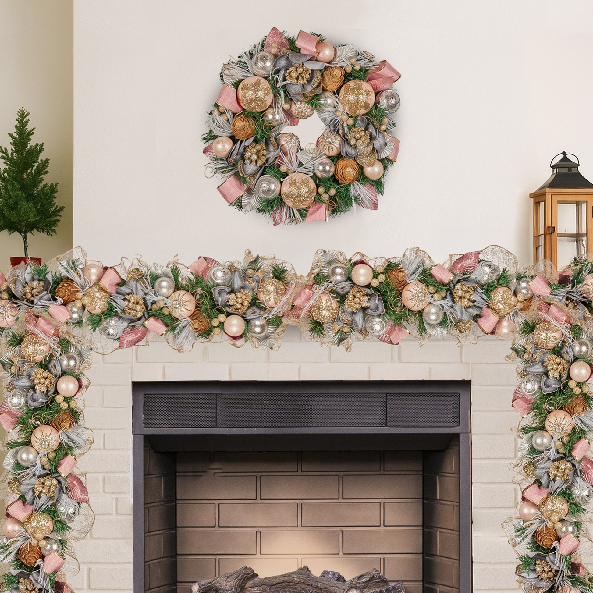 Dress up your holiday spaces with a garland that sparkles in pink, champagne and silver. Pre-decorated with florals, baubles, pine cones and berries, its lush green foliage brings festive warmth to shelves, banisters or trees—no fluffing or fussing required, just instant Christmas charm wherever you drape it.
