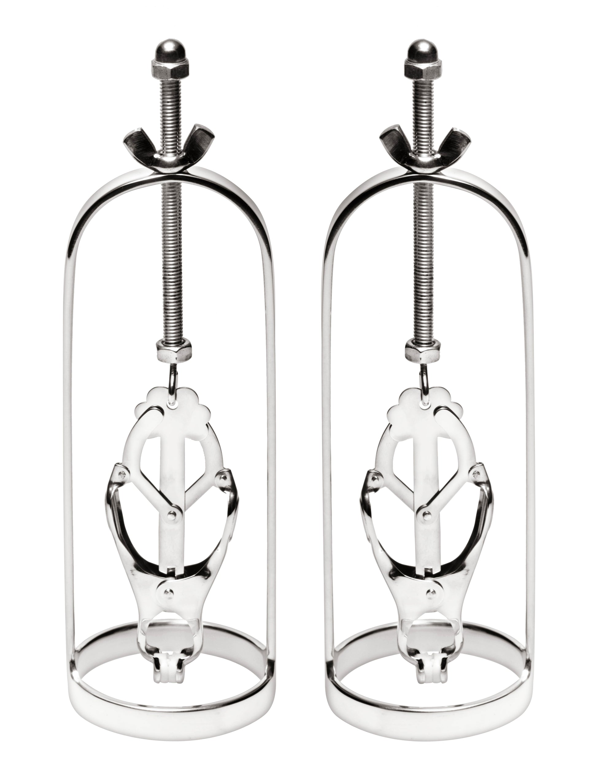 - Comprised of a stainless steel frame supporting a dangling clover clamp it is designed to grip tighter the further the nipple is stretched. Just affix the clamp just behind the nipple and twist on the wing nut.