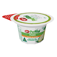 Spc Provital Pears In Juice Consists Of Freshly Diced Pear And Refined Fruit Juice. The Pears Are Filled Into Pre-Formed Plastic Cups Along With The Refined Fruit Juice Ingredients: Australian Grown Diced Pears (60% Min), Refined Fruit Juice, Food Acid (Citric), Antioxidant (Ascorbic Acid)